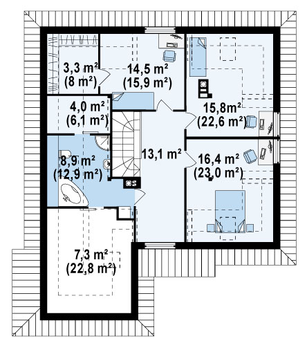 Фасад: деревянные панели 140х16 мм, имитирующие брус, с пазогребневым соединением.