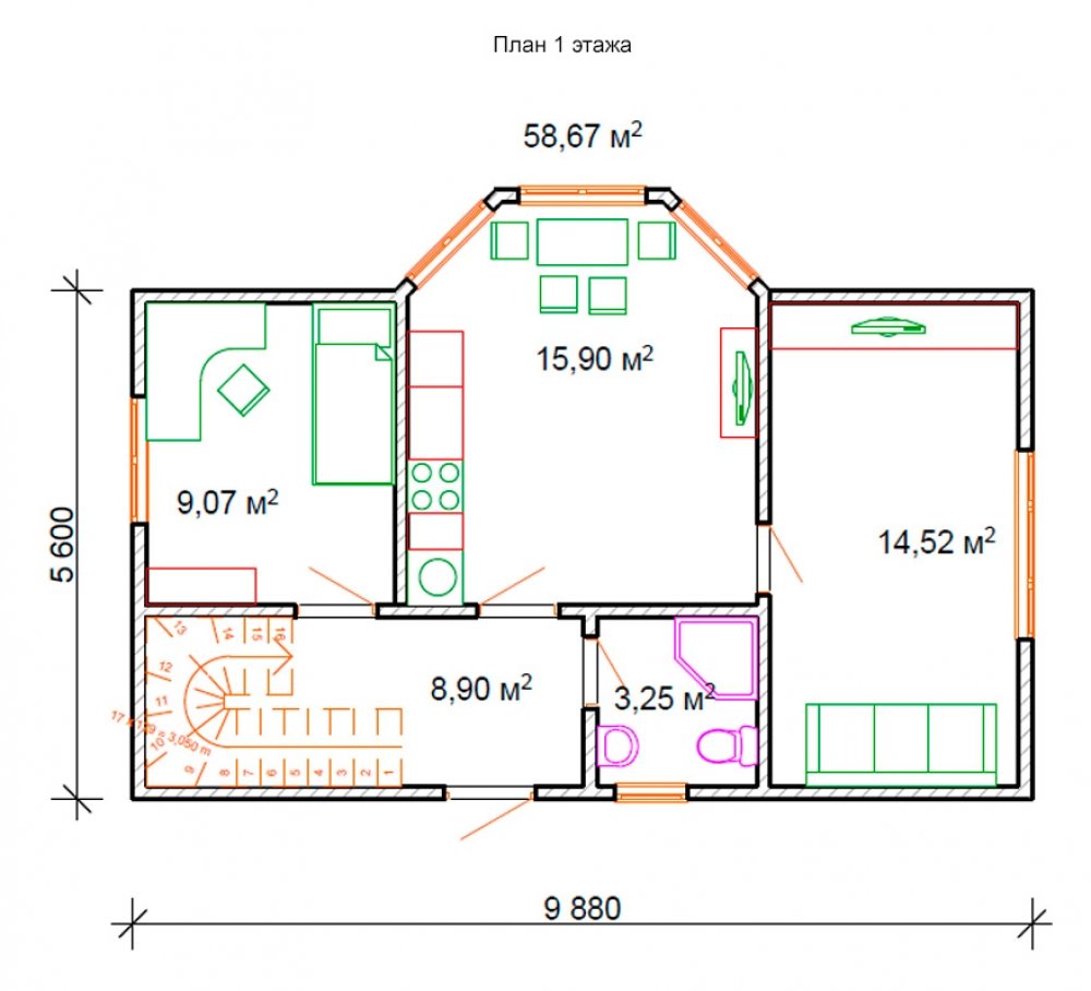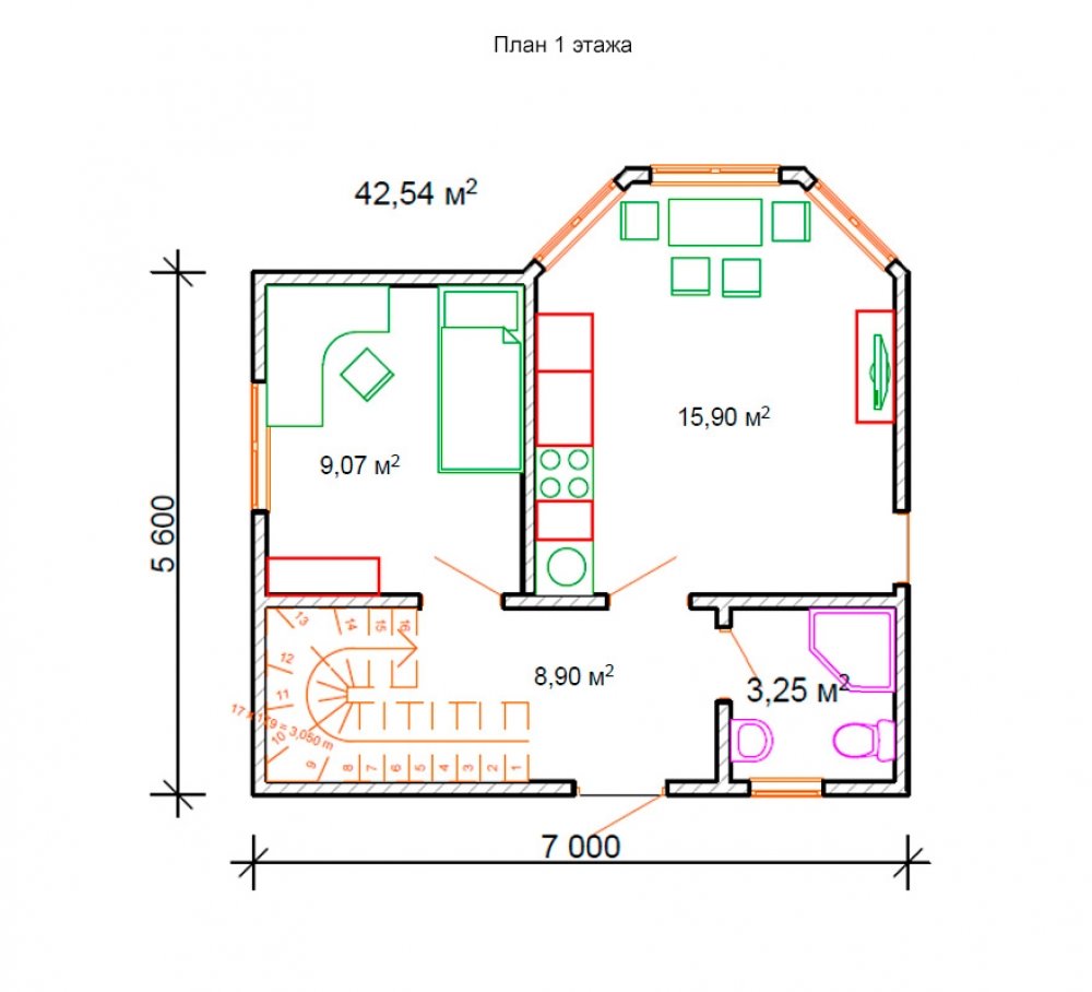Окна: ПВХ REHAU Grazio с 2-камерным стеклопакетом (3 стекла), 5-камерный профиль толщиной 70 мм. Комплектация включает подоконники, отливы и москитные сетки.