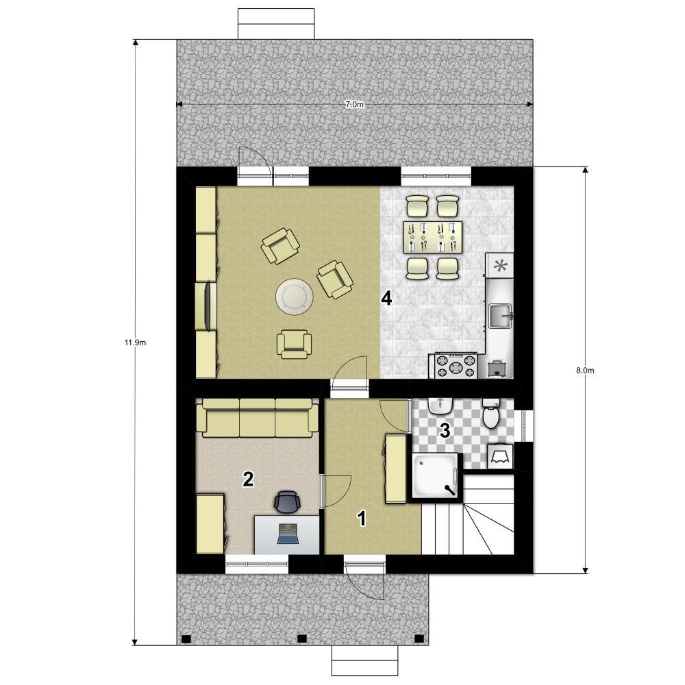 Окна: ПВХ REHAU Grazio с 2-камерным стеклопакетом (3 стекла), 5-камерный профиль толщиной 70 мм. Комплектация включает подоконники, отливы и москитные сетки.