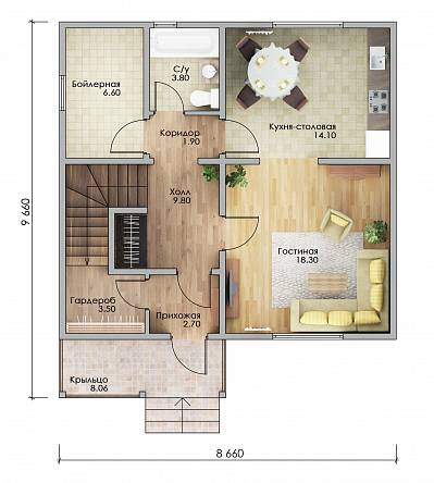 Наружные стены обеспечивают защиту от температурных перепадов, влаги и ветра. Базальтовый утеплитель и мембраны делают дом энергоэффективным. Внутренние перегородки с звукоизоляцией создают комфортную акустику.