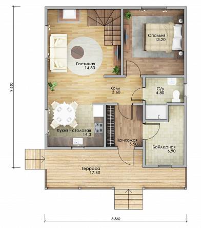 Наружные стены обеспечивают защиту от температурных перепадов, влаги и ветра. Базальтовый утеплитель и мембраны делают дом энергоэффективным. Внутренние перегородки с звукоизоляцией создают комфортную акустику.