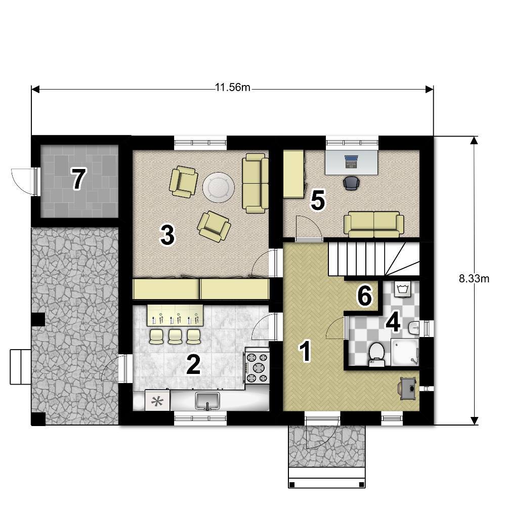 Окна: ПВХ REHAU Grazio с 2-камерным стеклопакетом (3 стекла), 5-камерный профиль толщиной 70 мм. Комплектация включает подоконники, отливы и москитные сетки.