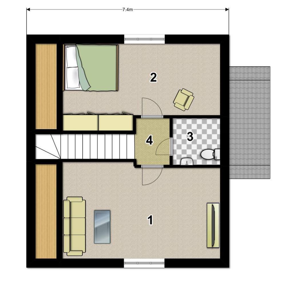 Фасад: деревянные панели 140х16 мм, имитирующие брус, с пазогребневым соединением.