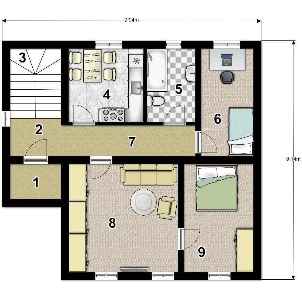Окна: ПВХ REHAU Grazio с 2-камерным стеклопакетом (3 стекла), 5-камерный профиль толщиной 70 мм. Комплектация включает подоконники, отливы и москитные сетки.