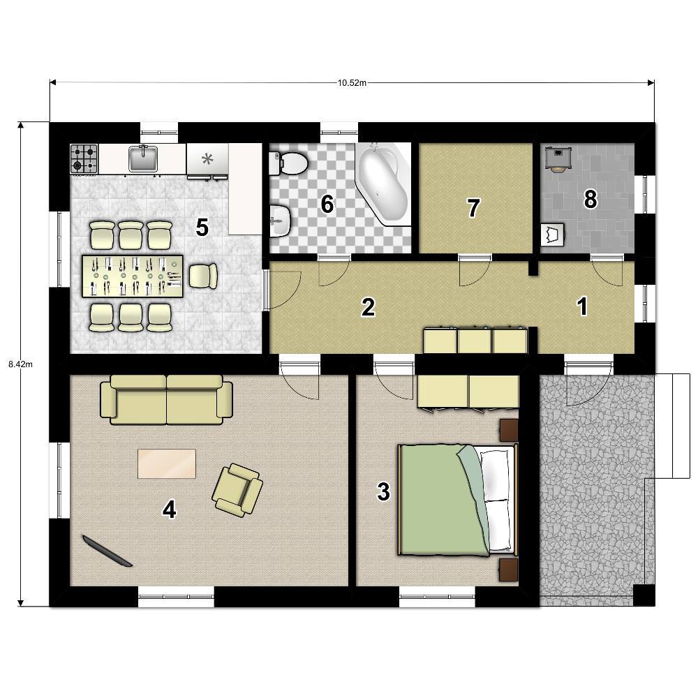 Окна: ПВХ REHAU Grazio с 2-камерным стеклопакетом (3 стекла), 5-камерный профиль толщиной 70 мм. Комплектация включает подоконники, отливы и москитные сетки.