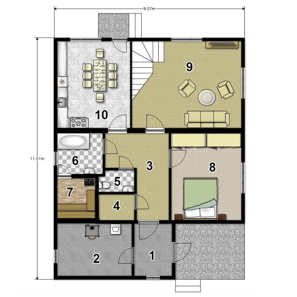 Наружные стены обеспечивают защиту от температурных перепадов, влаги и ветра. Базальтовый утеплитель и мембраны делают дом энергоэффективным. Внутренние перегородки с звукоизоляцией создают комфортную акустику.