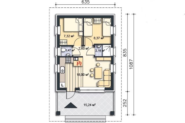 Фасад: деревянные панели 140х16 мм, имитирующие брус, с пазогребневым соединением.