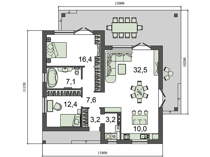Фасад: деревянные панели 140х16 мм, имитирующие брус, с пазогребневым соединением.