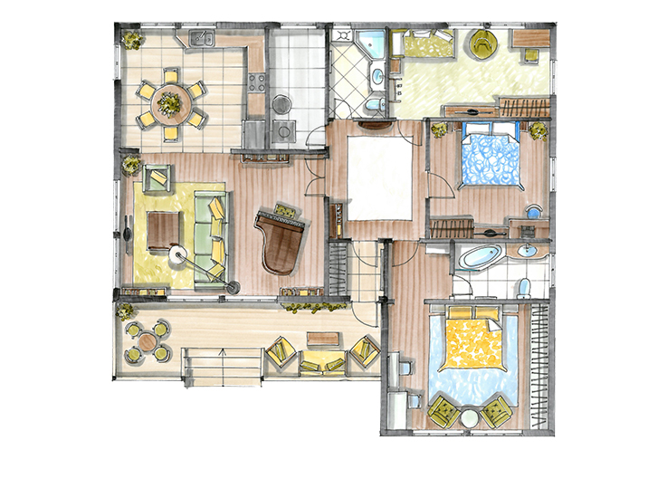 Наружные стены обеспечивают защиту от температурных перепадов, влаги и ветра. Базальтовый утеплитель и мембраны делают дом энергоэффективным. Внутренние перегородки с звукоизоляцией создают комфортную акустику.