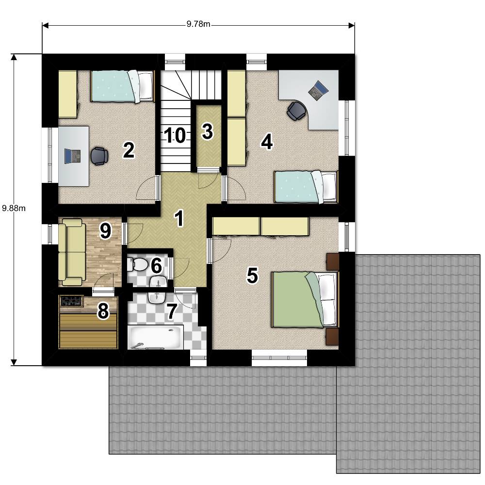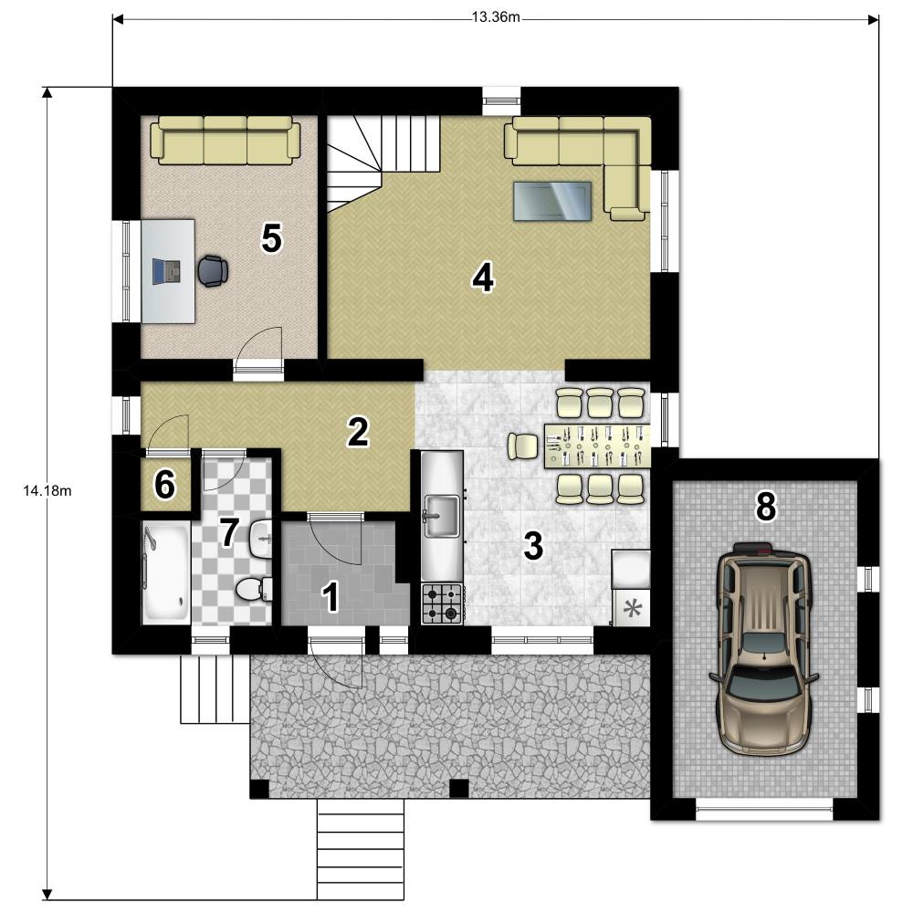Наружные стены обеспечивают защиту от температурных перепадов, влаги и ветра. Базальтовый утеплитель и мембраны делают дом энергоэффективным. Внутренние перегородки с звукоизоляцией создают комфортную акустику.