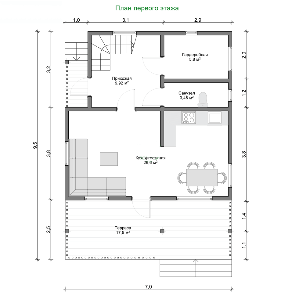 Наружные стены обеспечивают защиту от температурных перепадов, влаги и ветра. Базальтовый утеплитель и мембраны делают дом энергоэффективным. Внутренние перегородки с звукоизоляцией создают комфортную акустику.