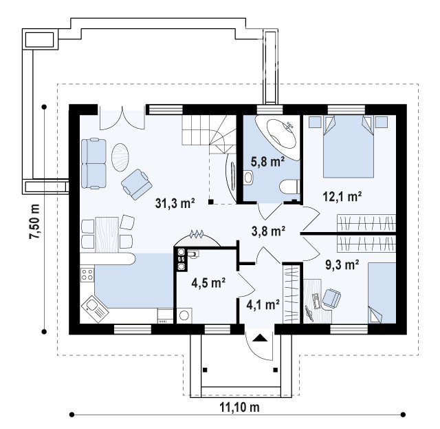 Наружные стены обеспечивают защиту от температурных перепадов, влаги и ветра. Базальтовый утеплитель и мембраны делают дом энергоэффективным. Внутренние перегородки с звукоизоляцией создают комфортную акустику.