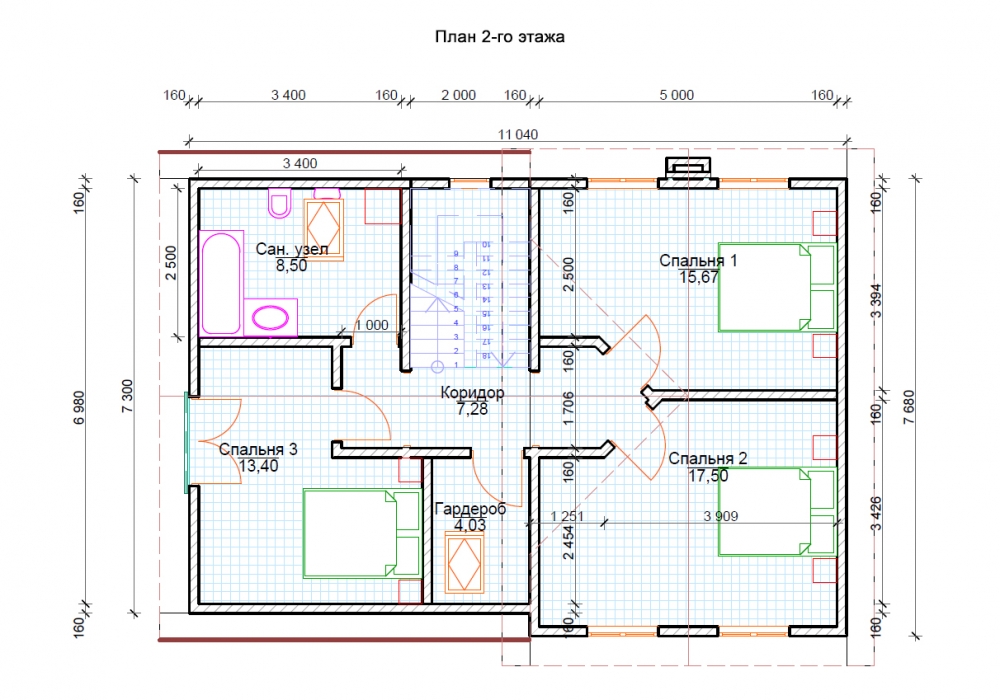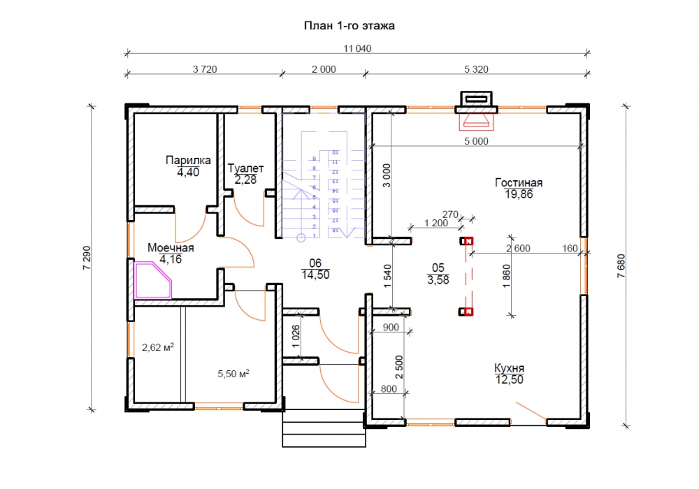 • Перегородки: каркас из доски 45х90 мм, звукоизоляция базальтовыми плитами 100 мм.