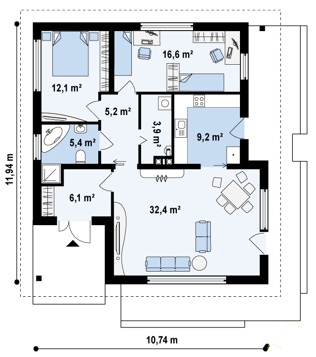 Окна: ПВХ REHAU Grazio с 2-камерным стеклопакетом (3 стекла), 5-камерный профиль толщиной 70 мм. Комплектация включает подоконники, отливы и москитные сетки.