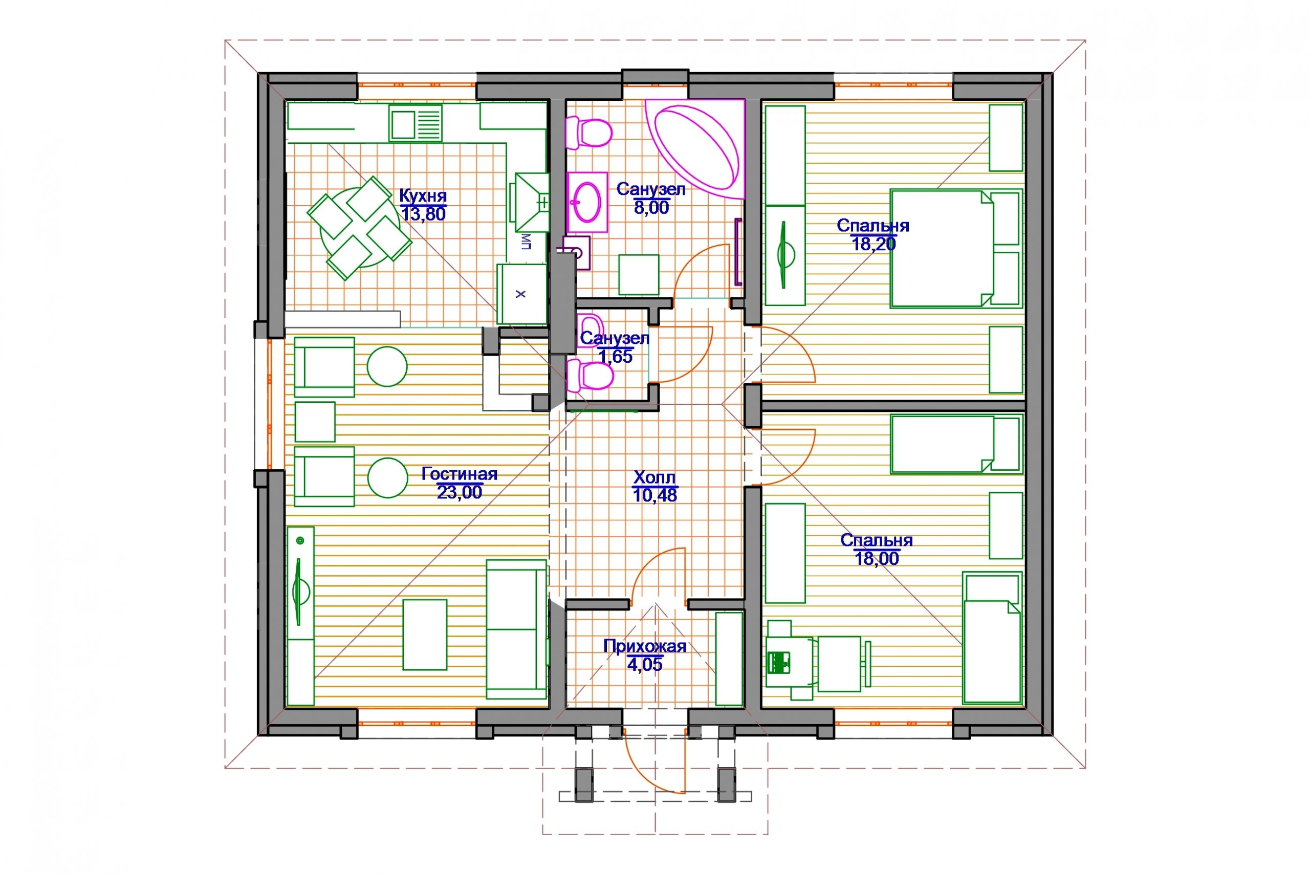 Наружные стены обеспечивают защиту от температурных перепадов, влаги и ветра. Базальтовый утеплитель и мембраны делают дом энергоэффективным. Внутренние перегородки с звукоизоляцией создают комфортную акустику.