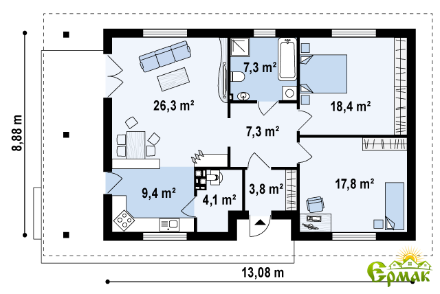 Фасад: деревянные панели 140х16 мм, имитирующие брус, с пазогребневым соединением.