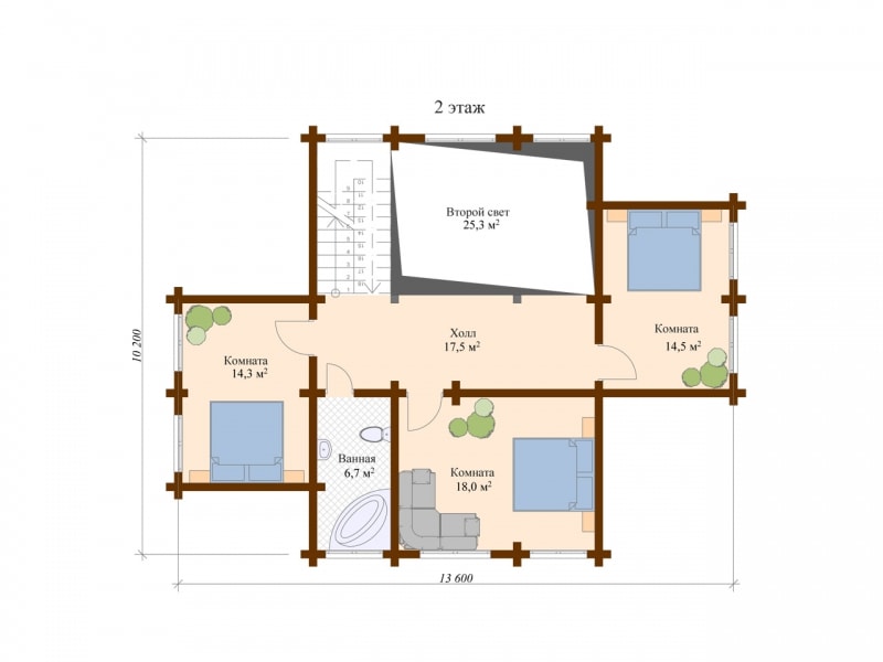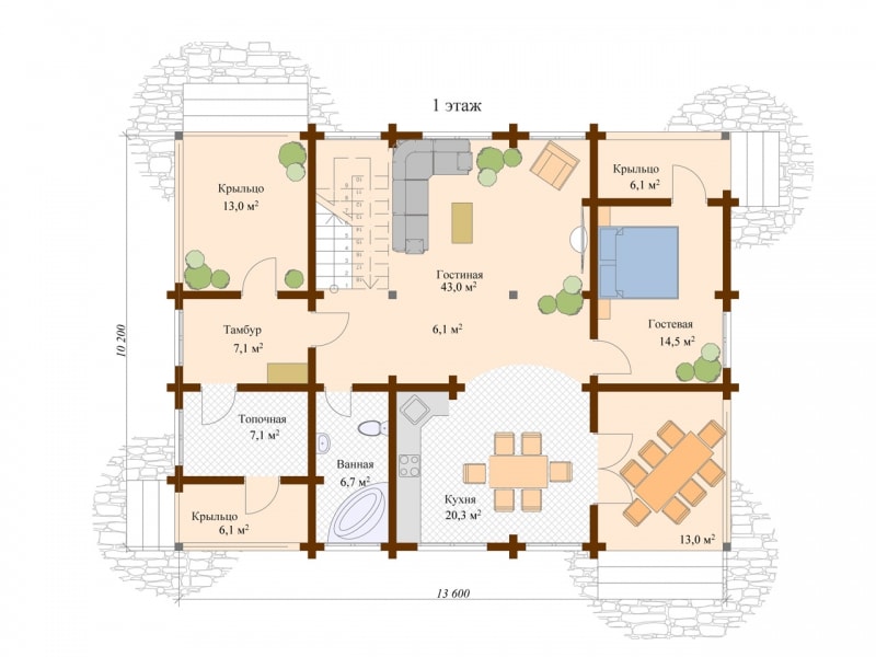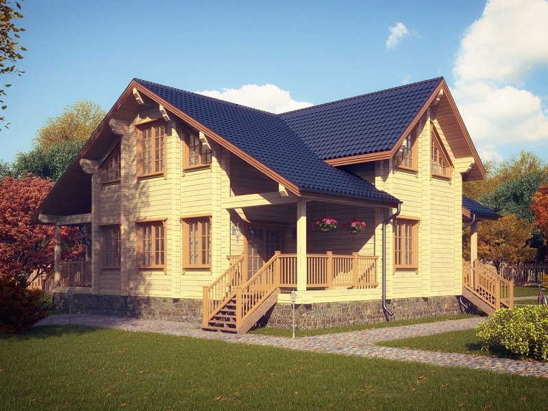 Фасад: деревянные панели 140х16 мм, имитирующие брус, с пазогребневым соединением.