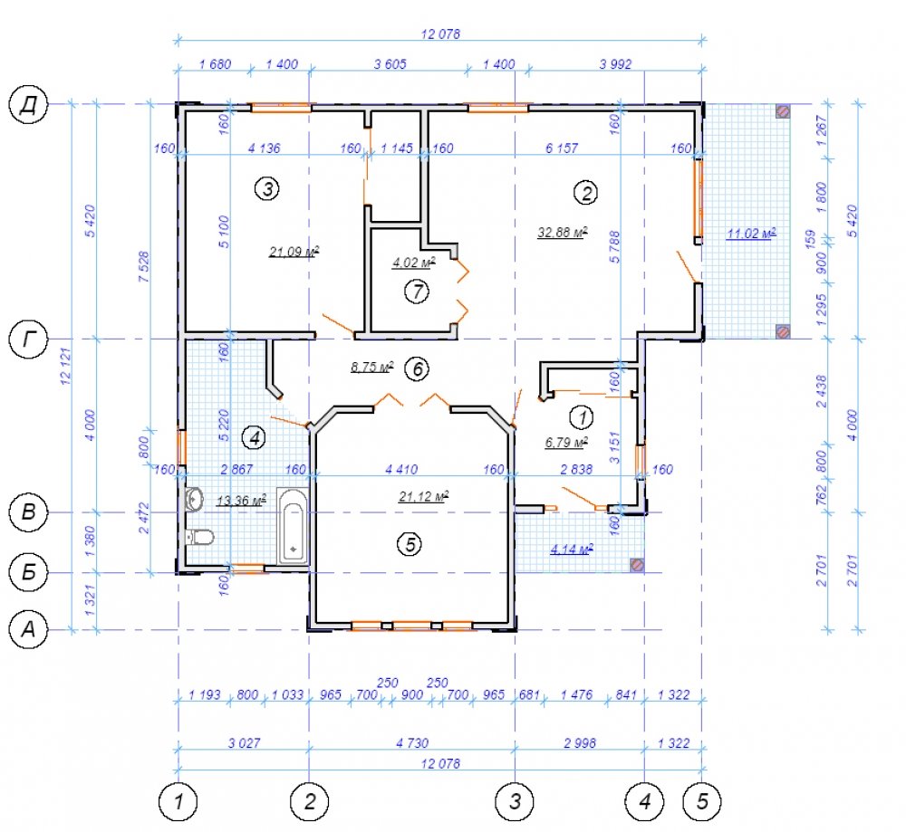 • Перегородки: каркас из доски 45х90 мм, звукоизоляция базальтовыми плитами 100 мм.