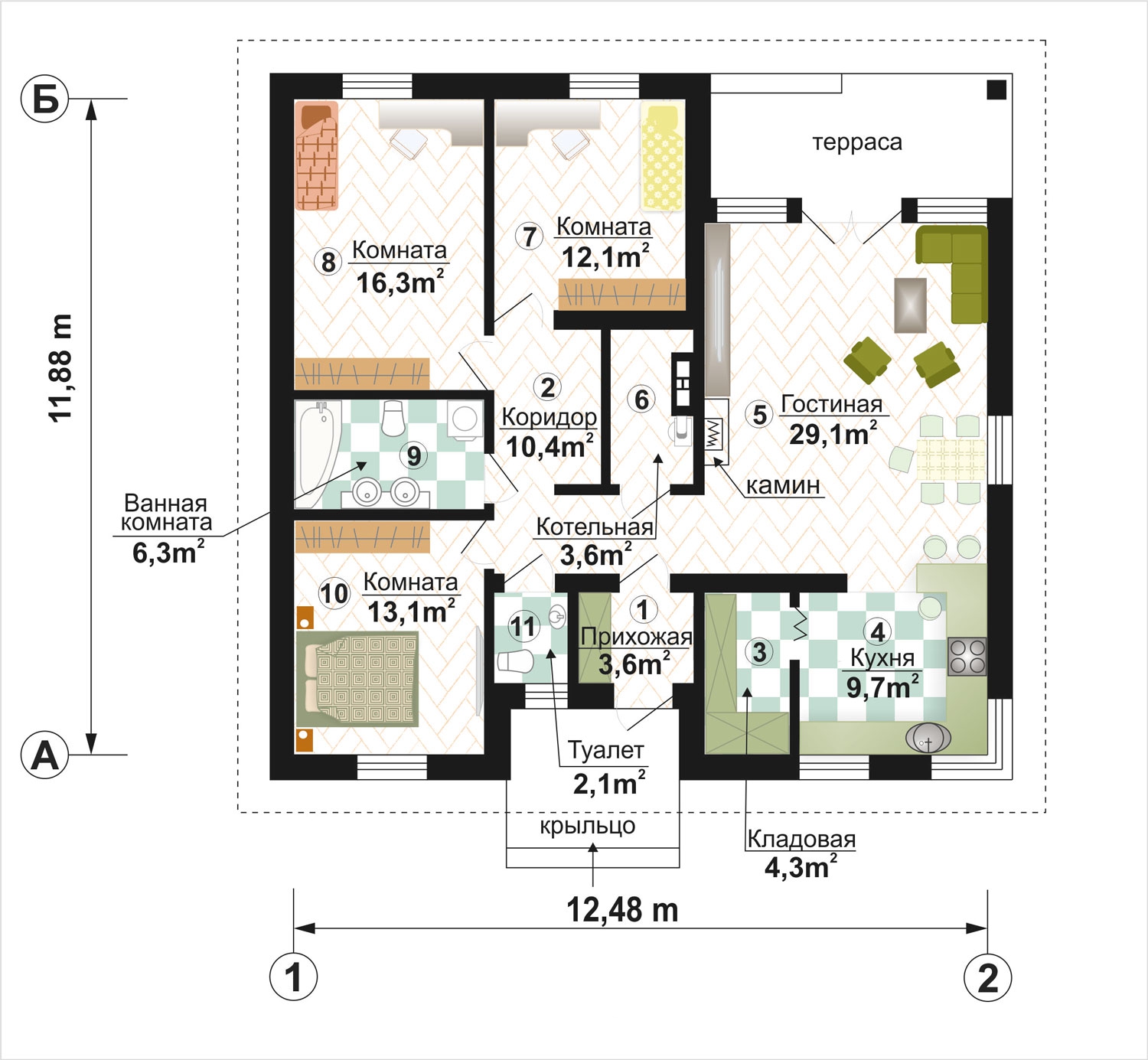Наружные стены обеспечивают защиту от температурных перепадов, влаги и ветра. Базальтовый утеплитель и мембраны делают дом энергоэффективным. Внутренние перегородки с звукоизоляцией создают комфортную акустику.